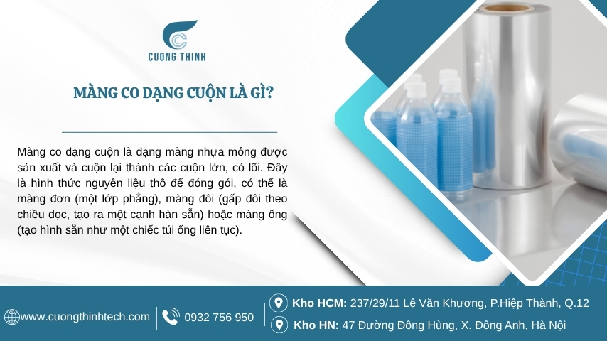 Hai dạng chính của màng co nhiệt (shrink film) trong đóng gói là màng co dạng cuộn và màng co dạng túi. Cả hai đều được sử dụng để bọc sản phẩm, bảo vệ khỏi bụi bẩn, độ ẩm và tăng tính thẩm mỹ bằng cách co lại dưới tác dụng của nhiệt, ôm sát mọi hình dạng của vật thể.